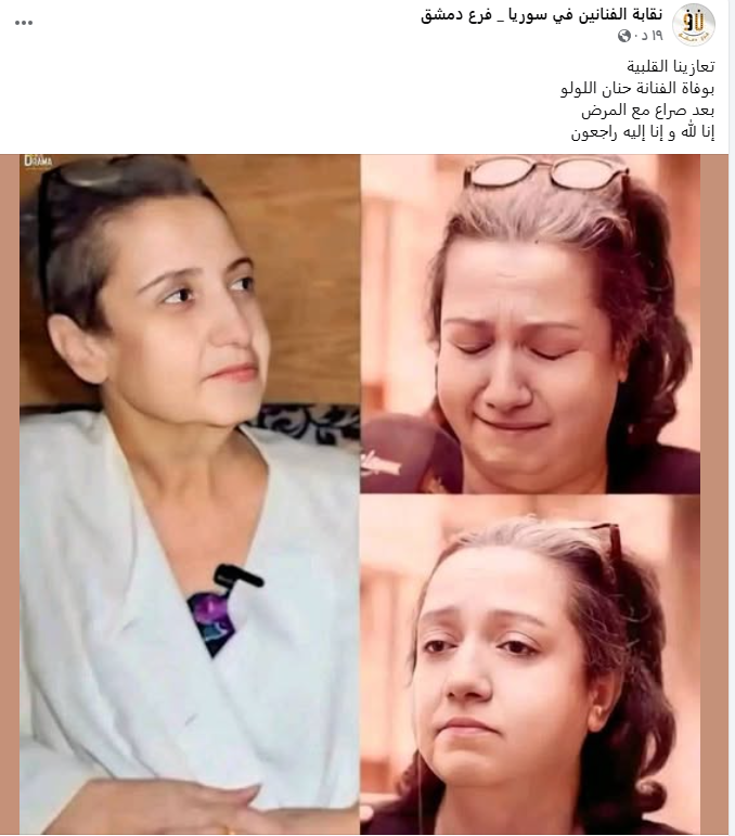 أعلنت نقابة الفنانين في سوريا، وفاة الفنانة القديرة حنان اللولو بعد صراع مع المرض.