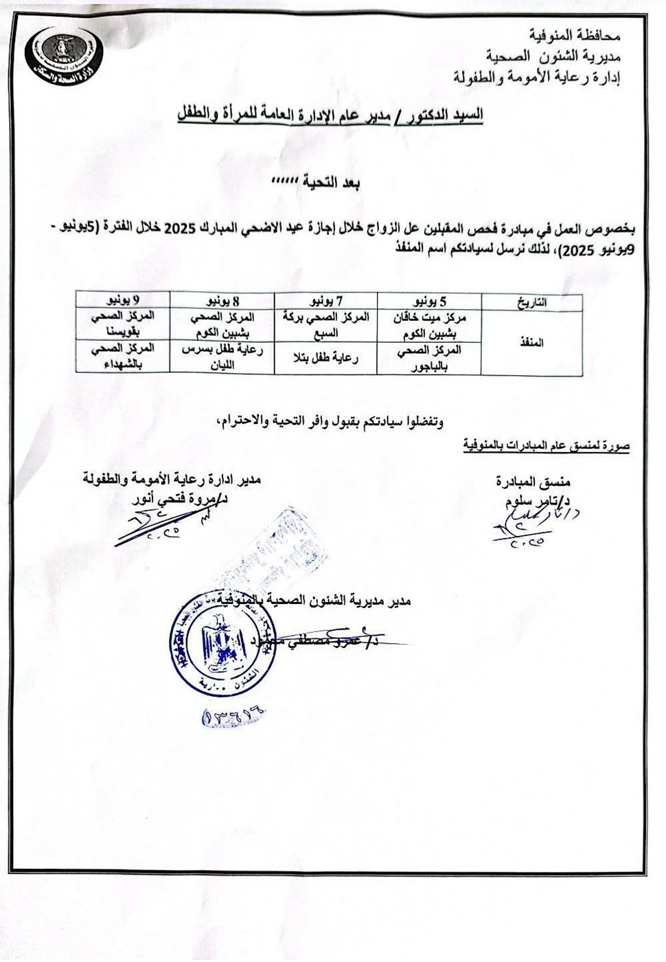 وتم توجيه نسخة من الجدول التنفيذي للمبادرة إلى منسق عام المبادرات بمحافظة المنوفية، على أن يتولى الدكتور تامر سلوم، منسق المبادرة، الإشراف الكامل على التنفيذ، لضمان تقديم الخدمة بجودة وكفاءة عالية خلال أيام العطلة الرسمية.