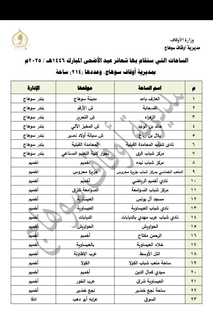 الساحات المعتمدة من أوقاف سوهاج لصلاة عيد الأضحى المبارك | مستندات