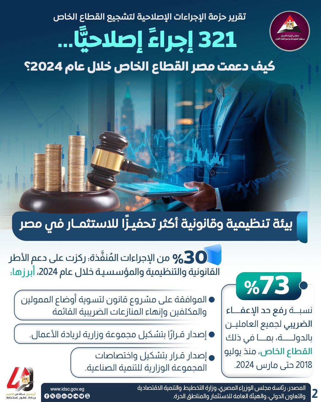 وفي هذا الصدد أصدر مركز المعلومات ودعم اتخاذ القرار بمجلس الوزراء، تقرير حزمة الإجراءات الإصلاحية لتشجيع القطاع الخاص، والذي سلَّط الضوء على 500 إجراء إصلاحي اتخذتها الدولة المصرية لدعم القطاع الخاص، خلال الفترة (مايو 2022 - ديسمبر 2024)، وعليه شهد عام 2024 مجموعة من الإجراءات بعدد 321 إجراءً تمثل 64.2%من مجمل الإصلاحات المنفذة خلال الفترة المُشار إليها.