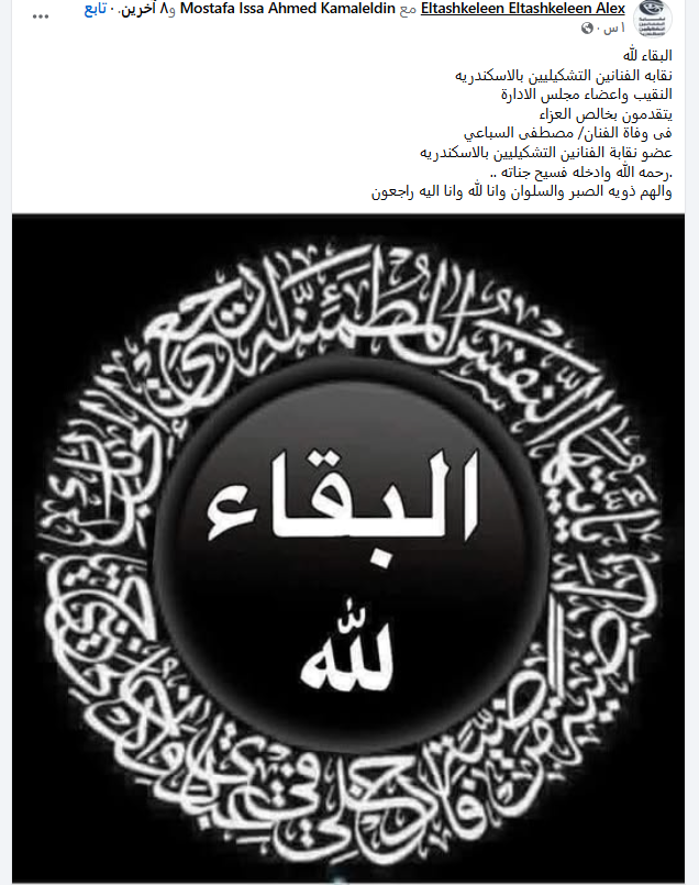 ونشرت نقابة الفنانين التشكيليين بالإسكندرية، عبر حسابها الشخصي على موقع الفيس بوك: البقاء لله، نقابة الفنانين التشكيليين بالإسكندرية، النقيب وأعضاء مجلس الإدارة، يتقدمون بخالص العزاء فى وفاة الفنان مصطفى السباعي، عضو نقابة الفنانين التشكيليين بالإسكندرية، رحمه الله وأدخله فسيح جناته، وألهم ذويه الصبر والسلوان وإنا لله وإنا إليه راجعون.