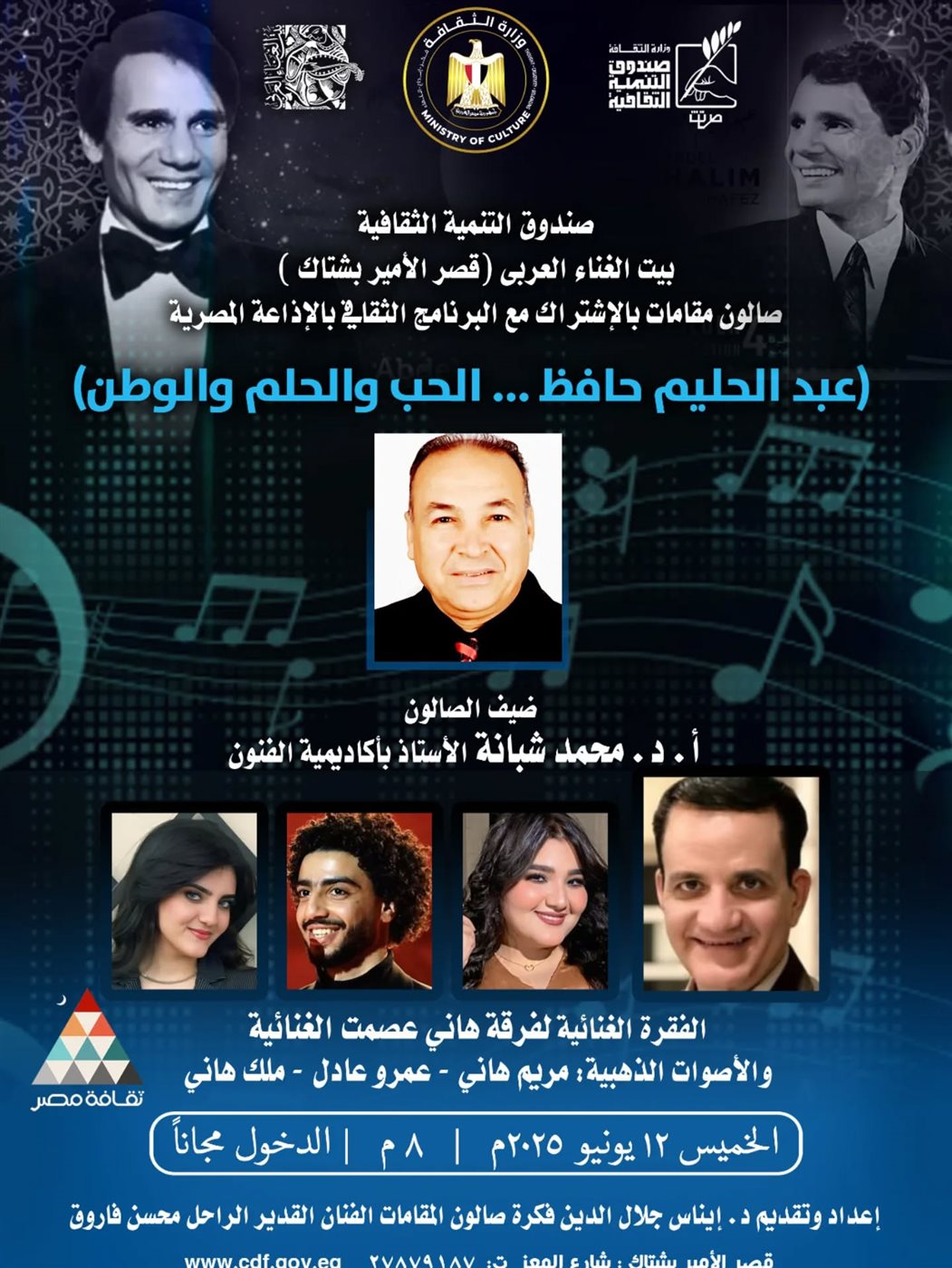 يقيم بيت الغناء العربي بقصر الأمير بشتاك بشارع المعز، في إطار الأنشطة الفنية التى ينظمها قطاع صندوق التنمية الثقافية برئاسة المعماري حمدي السطوحي، والتي تهدف إلى دعم الفنون التراثية وإحياء ذاكرة الغناء المصري الأصيل، أمسية جديدة من أمسيات صالون (مقامات) بالاشتراك مع البرنامج الثقافي بالإذاعة المصرية، بعنوان (عبد الحليم حافظ... الحب والحلم والوطن) وذلك في الثامنة مساء غدًا الخميس 12 يونيو.