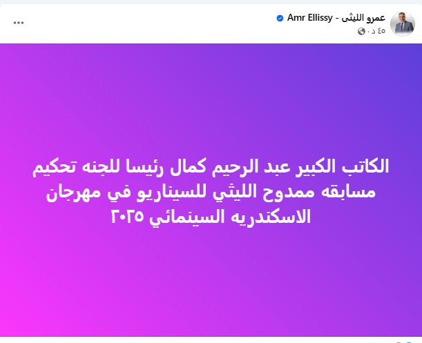 ونشر الإعلامي عمرو الليثي عبر حسابه الشخصي على موقع فيسبوك: الكاتب الكبير عبد الرحيم كمال رئيسًا للجنة تحكيم مسابقة ممدوح الليثي للسيناريو في مهرجان الإسكندرية السينمائي لعام 2025.