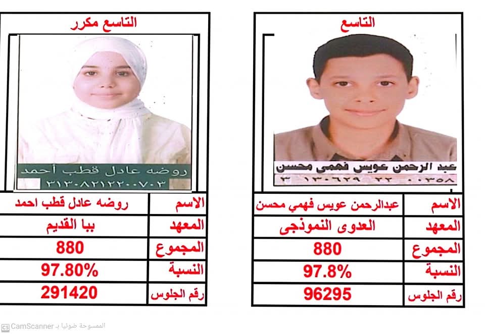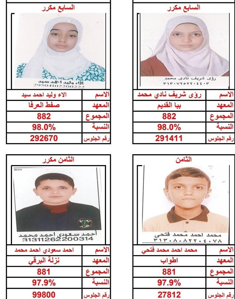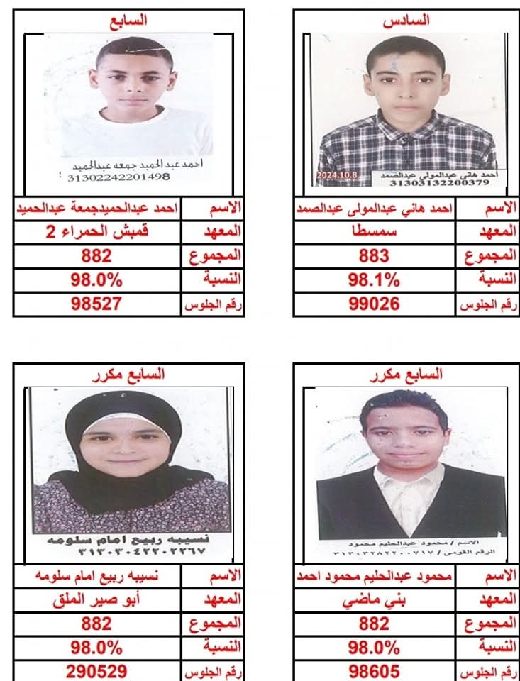 وفيما يلي ننشر أسماء وصور أوائل الشهادة الابتدائية الأزهرية بمنطقة بني سويف: