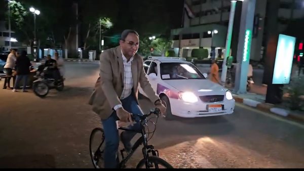 خلال عودته بعد انتهاء عمله.. محافظ قنا يتجول بالدراجة في ليلًا شوارع قنا