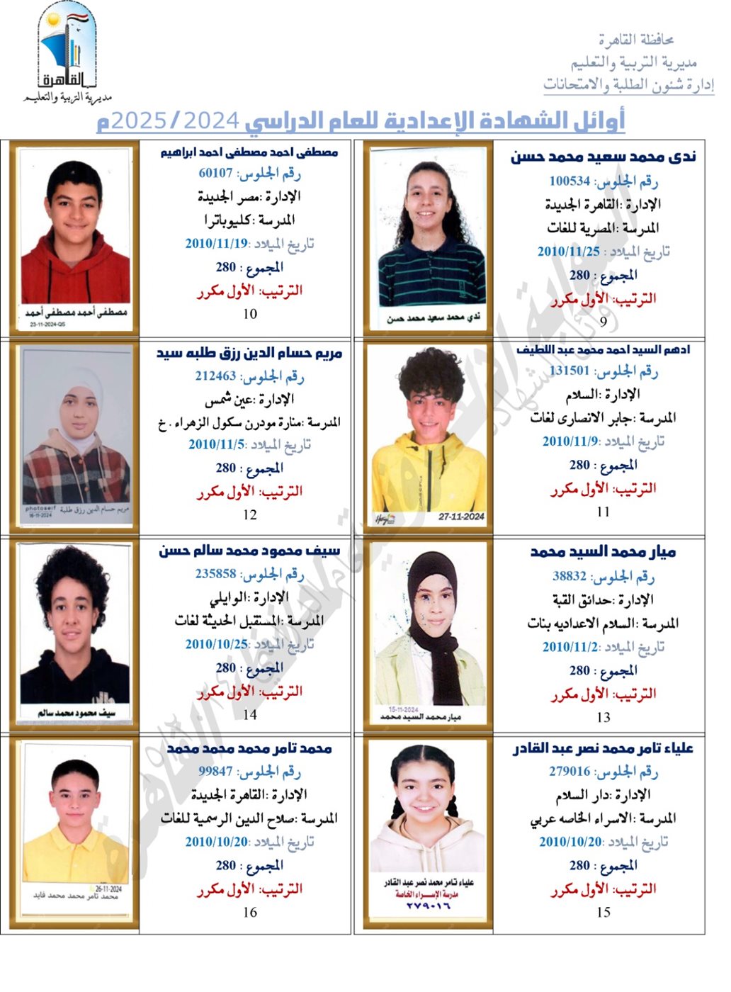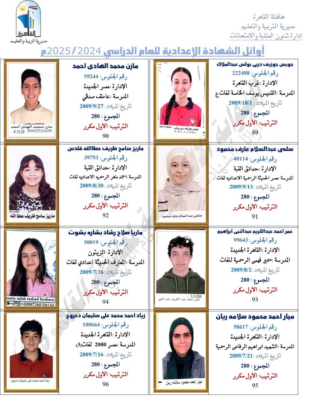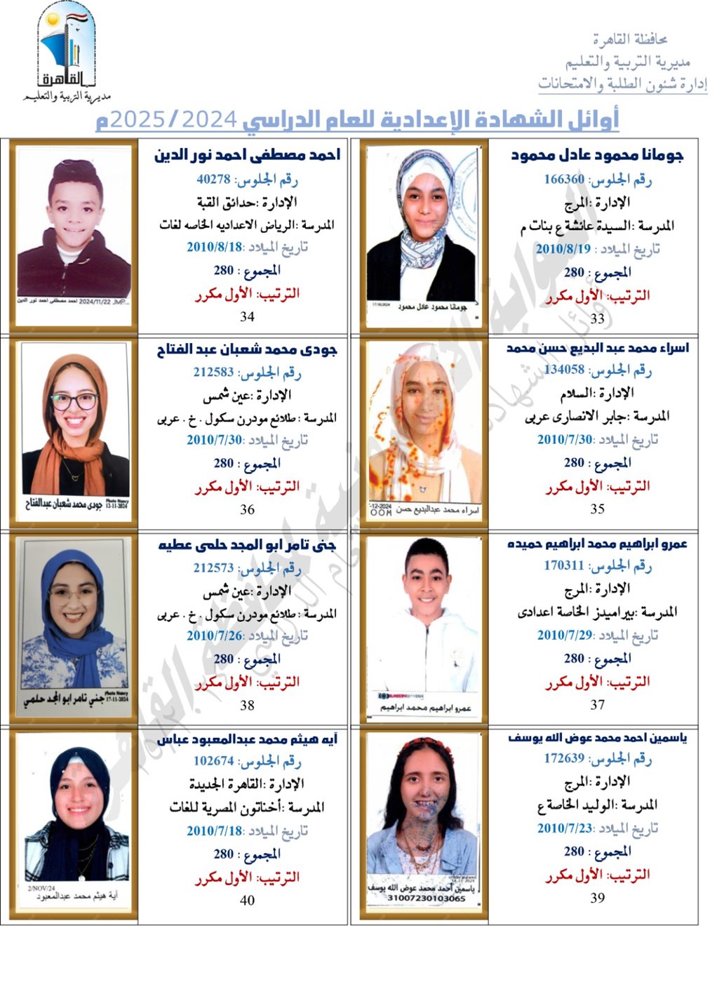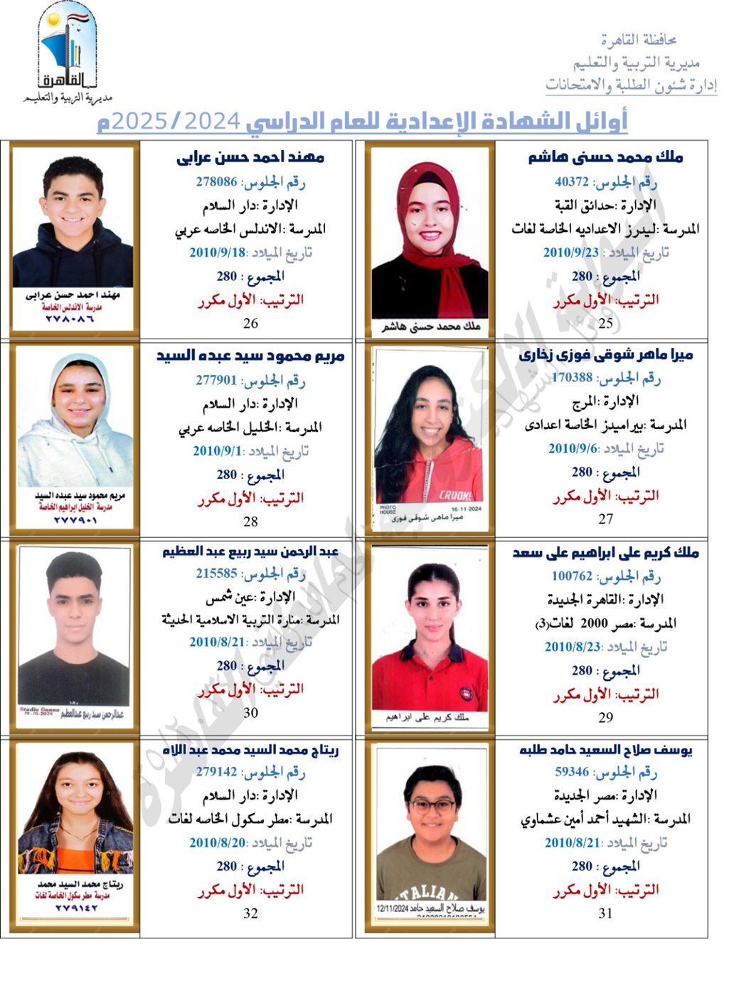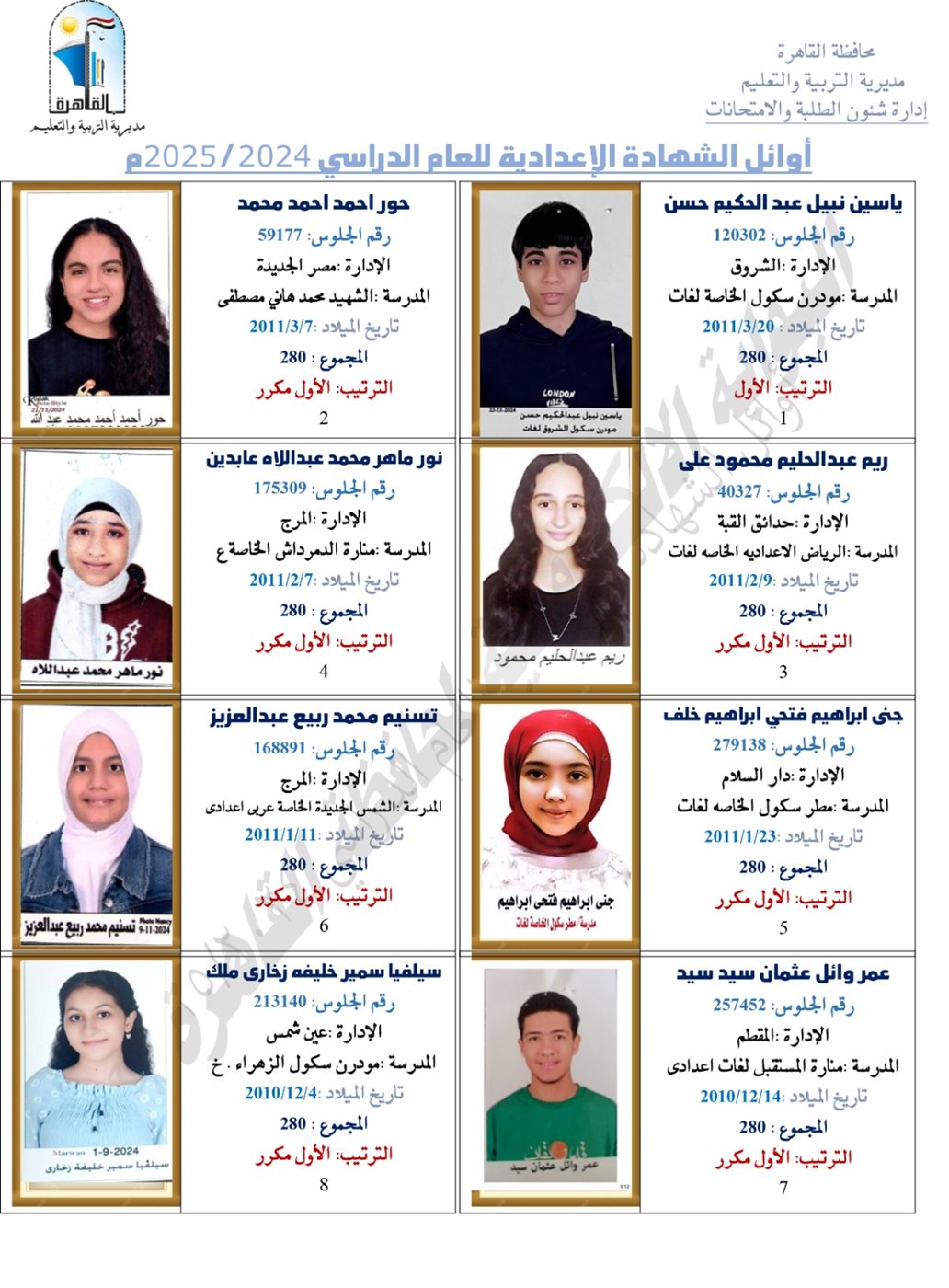 حلوان في الصدارة.. محافظة القاهرة تنشر أسماء وصور أوائل الشهادة الإعدادية | رابط النتيجة