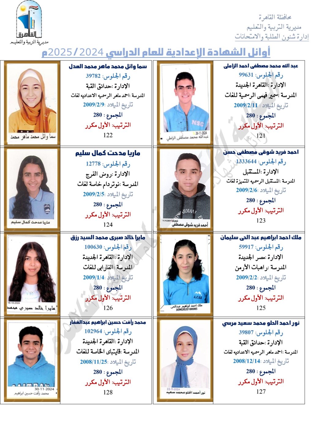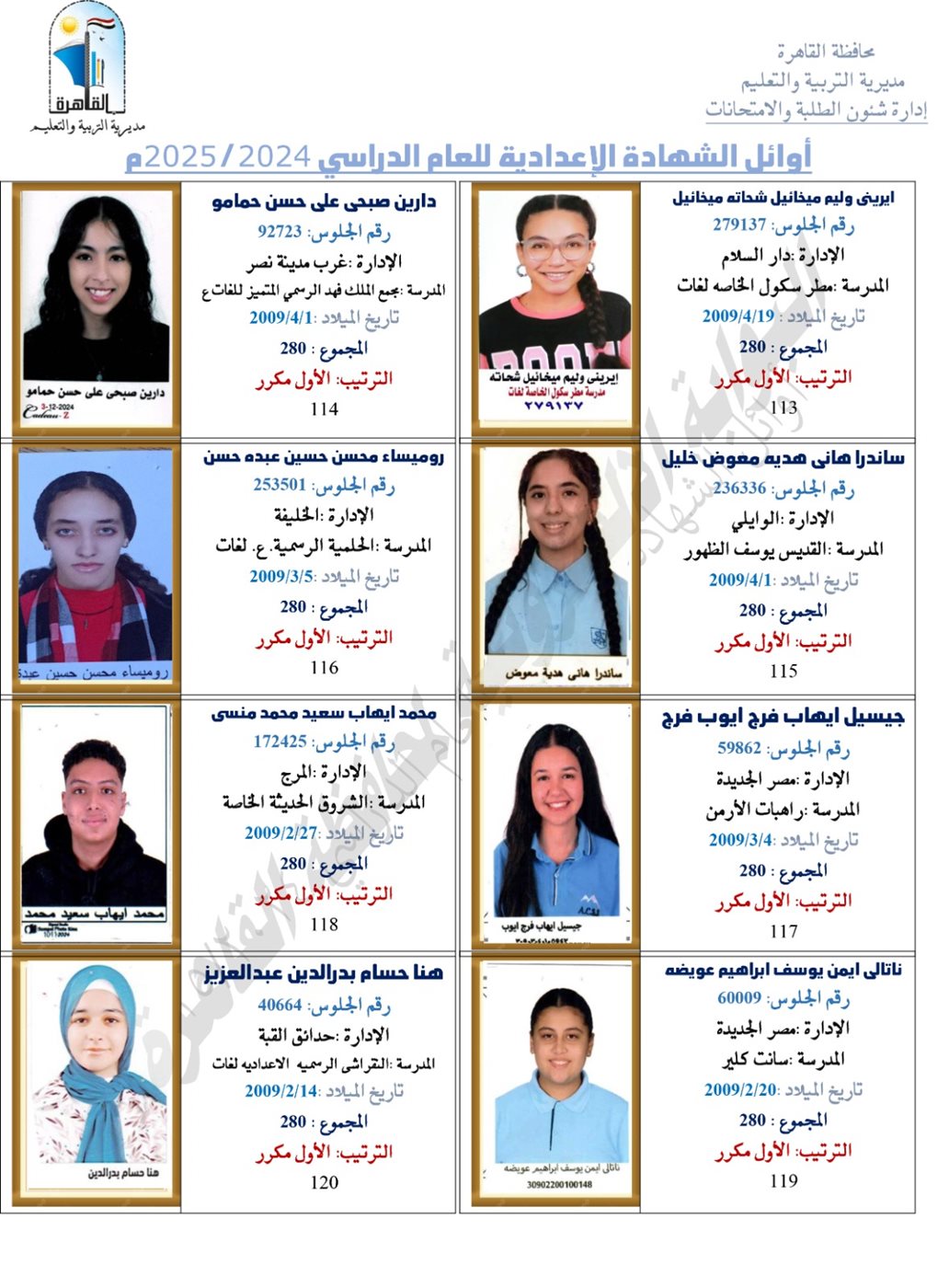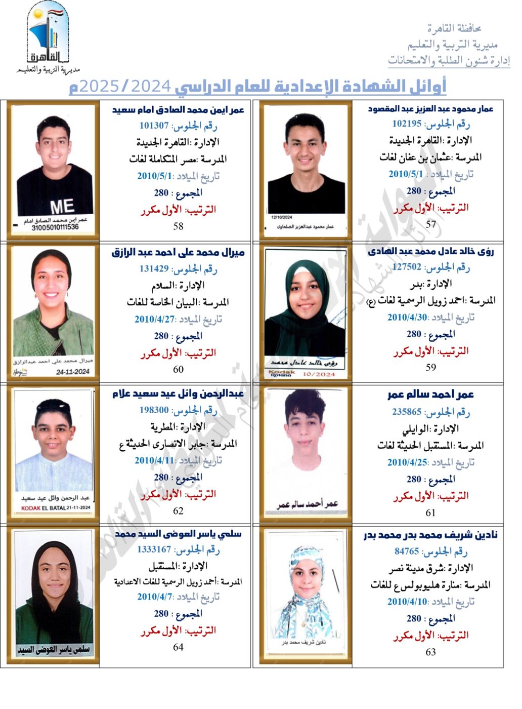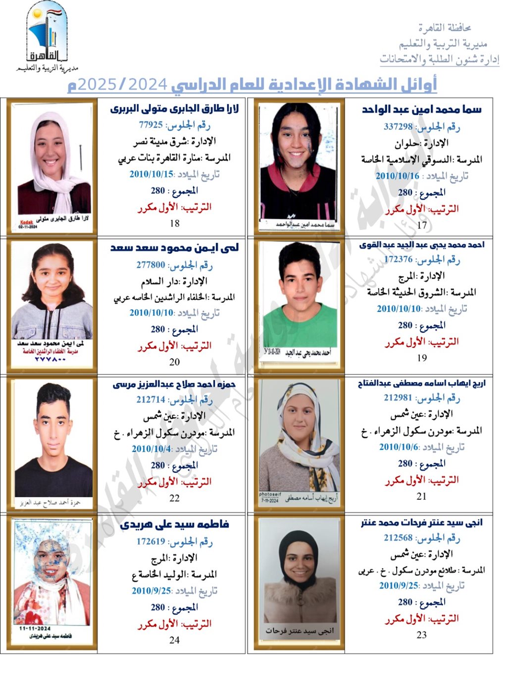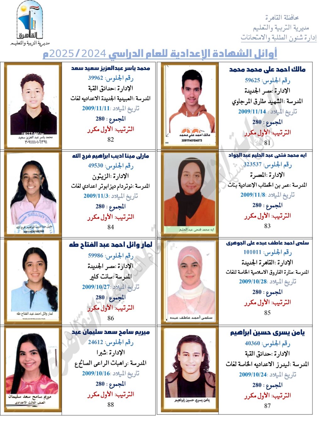 حلوان في الصدارة.. محافظة القاهرة تنشر أسماء وصور أوائل الشهادة الإعدادية | رابط النتيجة