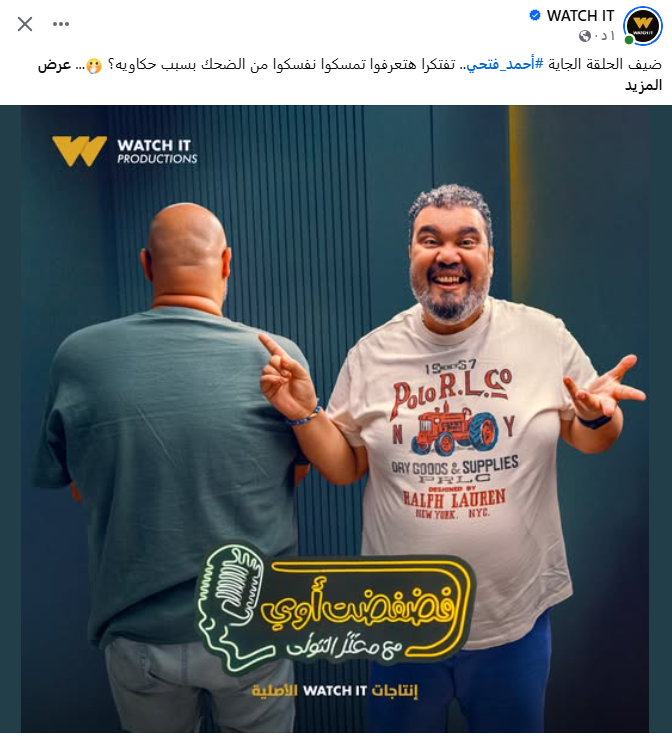 يحل الفنان أحمد فتحي ضيفا على المخرج معتز التوني، في برنامج فضفضت أوي، المُذاع عبر منصة watch it، حيث يتحدث الفنان خلال الحلقة عن العديد من كواليس أعماله الفنية، هذا بجانب الحديث عن أسرار حياته.