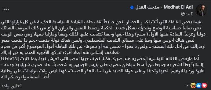 وأضاف مدحت العدل: أما ما يخص الفنانة التونسية المصرية هند صبري فكلنا نعرف حبها لمصر التي تعيش فيها، وما كتبت إلا تعاطفًا إنسانيًا بحتًا نشعر به جميعا من أبسط مواطن مصري حتى رئيس الجمهورية شخصيا، هند صبري شبراوية جدعة - عايزة ورد يا إبراهيم- نحبها وتحبنا، وعلى هواة الصيد في الماء العكر الصمت، فهذا ليس وقت مزايدات على وطنية أحد.. استقيموا يرحمكم الله.