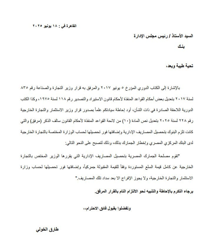 وأوضح المركزي في خطابه إلى رؤساء مجالس إدارات البنوك، أن القرار الوزاري الجديد عدل نص المادة (10) من لائحة القواعد المنفذة لأحكام قانون الاستيراد والتصدير رقم 118 لسنة 1975. وبموجب التعديل، تتولى مصلحة الجمارك المصرية تحصيل المصاريف الإدارية المقررة على كامل قيمة السلع المستوردة وفقًا للقيمة المقبولة جمركيًا، على أن تُضاف فور تحصيلها لحساب وزارة الاستثمار والتجارة الخارجية، ولا يُسمح بالإفراج الجمركي عن الواردات إلا بعد سداد تلك المصاريف.