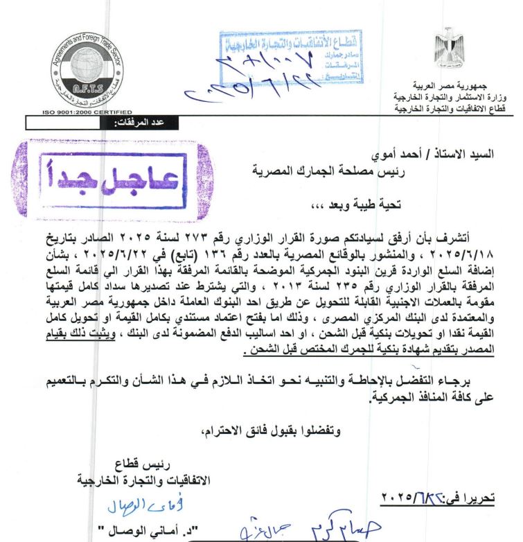 أصدرت الحكومة القرار الوزاري رقم 273 لسنة 2025، الذي يُلزم المصدرين بسداد القيمة الكاملة لبعض السلع قبل شحنها، وذلك عبر أحد البنوك العاملة داخل جمهورية مصر العربية. يأتي هذا القرار في إطار المتابعة المستمرة للتنظيمات المؤثرة على الصادرات المصرية، وقد تلقى المجلس التصديري للصناعات الغذائية نسخة من القرار لتنبيه أعضائه.