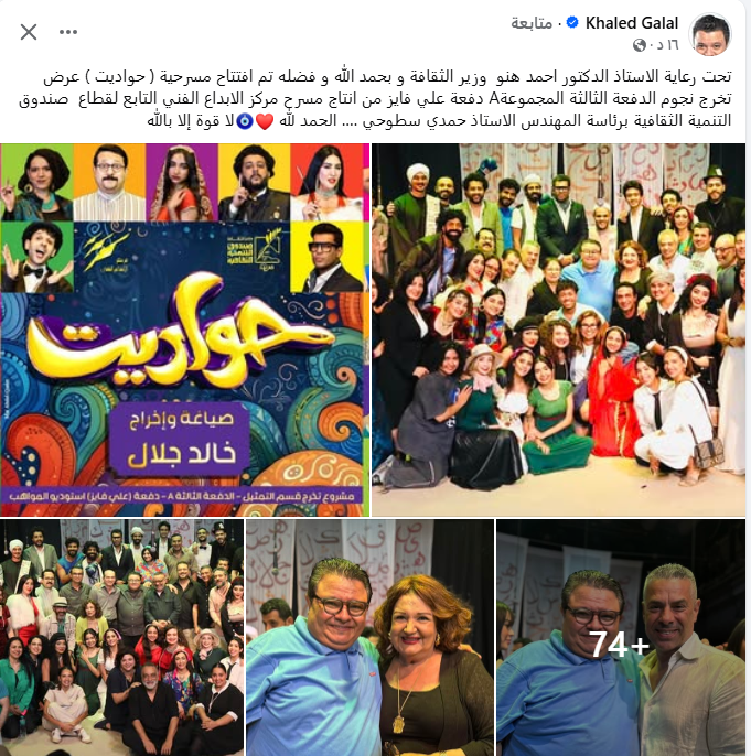 ونشر خالد جلال الصور، عبر حسابه الشخصي بموقع التواصل الاجتماعي فيس بوك، جاء فيه: تحت رعاية الدكتور أحمد هنو وزير الثقافة وبحمد الله وفضله تم افتتاح مسرحية حواديت، عرض تخرج نجوم الدفعة الثالثة المجموعةA دفعة علي فايز من إنتاج مسرح مركز الإبداع الفني التابع لقطاع صندوق التنمية الثقافية برئاسة المهندس الاستاذ حمدي سطوحي.. الحمد لله لا قوة إلا بالله.