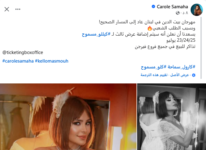 وكتبت كارول سماحة منشورا عبر حسابها الشخصي بفيس بوك، قالت فيه: مهرجان بيت الدين في لبنان عاد إلى المسار الصحيح، وبسبب الطلب الشعبي يسعدنا أن نعلن أنه سيتم إضافة عرض ثالث لـ كله مسموح يوم 23 يوليو القادم.