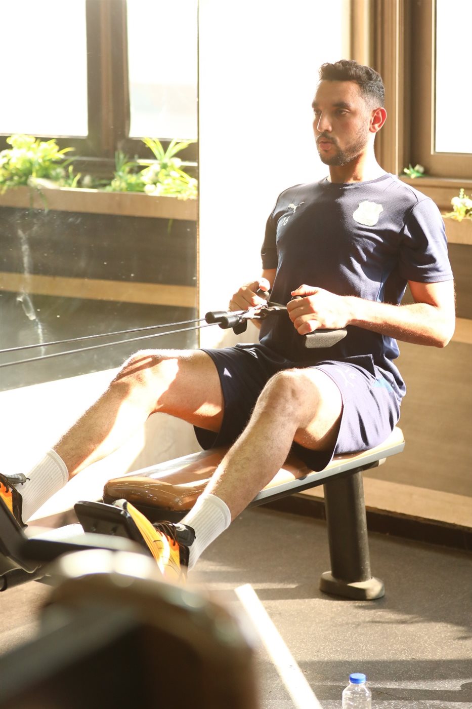 وخاض المصري مرانًا صباحيًا صباح اليوم الجمعة، في صالة الجيمانزيوم الملحقة بمقر إقامته بأحد فنادق مدينة بورفؤاد.