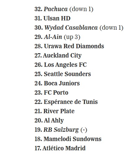وكشفت صحيفة ذا أثلتيك الأمريكية، عن تصنيف الأندية الـ 32 المشاركة في بطولة كأس العالم للأندية بعد ختام منافسات دور المجموعات.