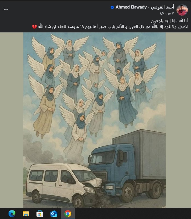 نعى الفنان أحمد العوضي ضحايا الحادث الأليم الذي وقع على الطريق الإقليمي بمحافظة المنوفية، والذي راح ضحيته 18 فتاة وشاب، في واقعة أثارت حالة من الحزن الشديد على مواقع التواصل الاجتماعي.