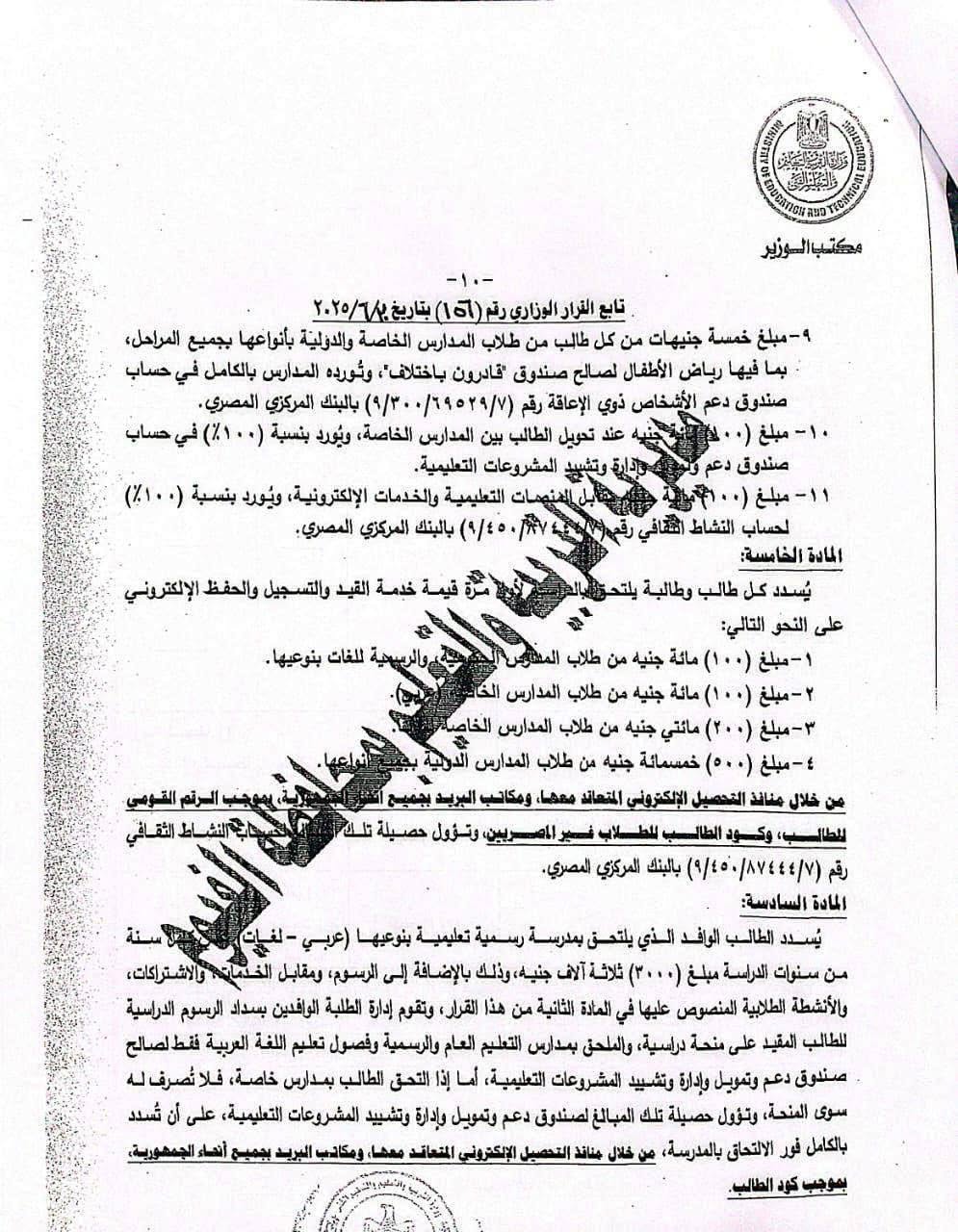 5 - مبلغ خمسة جنيهات من كل طالب لصالح صندوق تكريم شهدا ومفقودي ومصابي العمليات الحربية والإرهابية والأمنية، وأسرهم، ويورد بالكامل في حساب صندوق دعم وطويل وإدارة وتشييد المشروعات التعليمية.