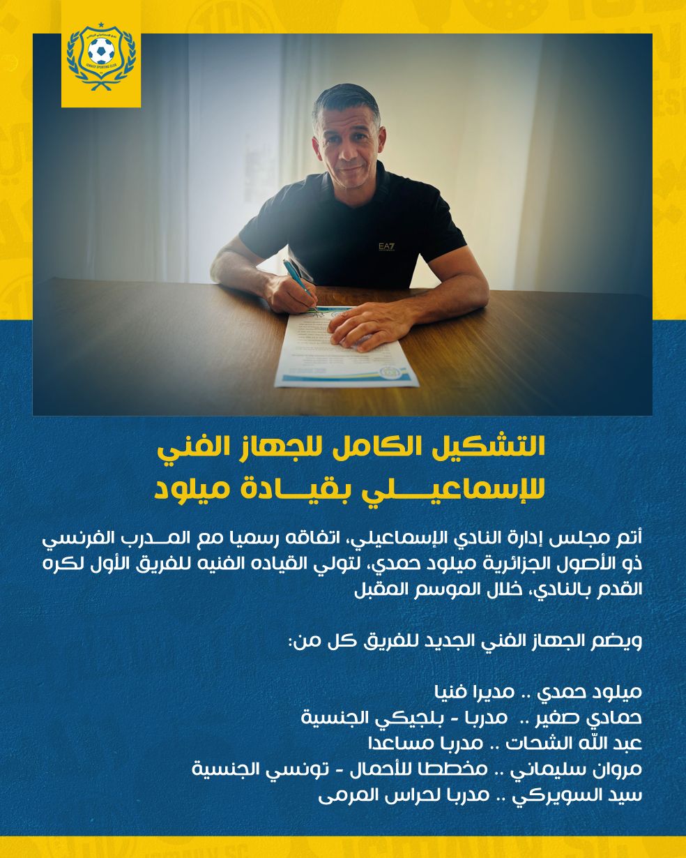 الإسماعيلي يعلن التشكيل الكامل للجهاز الفني بقيادة ميلود حمدي استعدادًا للموسم الجديد