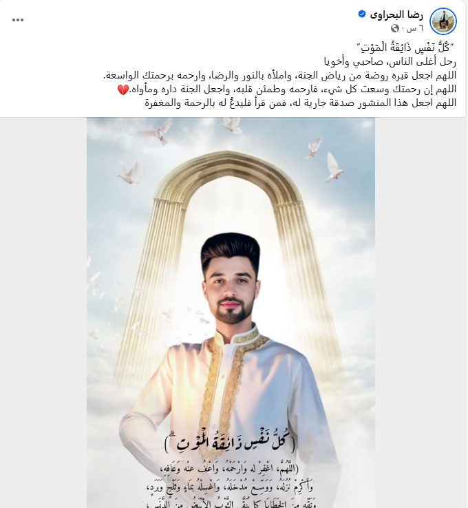 وكتب البحراوي نعيًا لصديقه الراحل، عبر حسابه على فيس بوك، قال فيه: “كُلُّ نَفْسٍ ذَائِقَةُ الْمَوْتِ”.. رحل أغلى الناس، صاحبي وأخويا، اللهم اجعل قبره روضة من رياض الجنة، واملأه بالنور والرضا، وارحمه برحمتك الواسعة، اللهم إن رحمتك وسعت كل شيء، فارحمه وطمئن قلبه، واجعل الجنة داره ومأواه، اللهم اجعل هذا المنشور صدقة جارية له، فمن قرأ فليدعُ له بالرحمة والمغفرة.