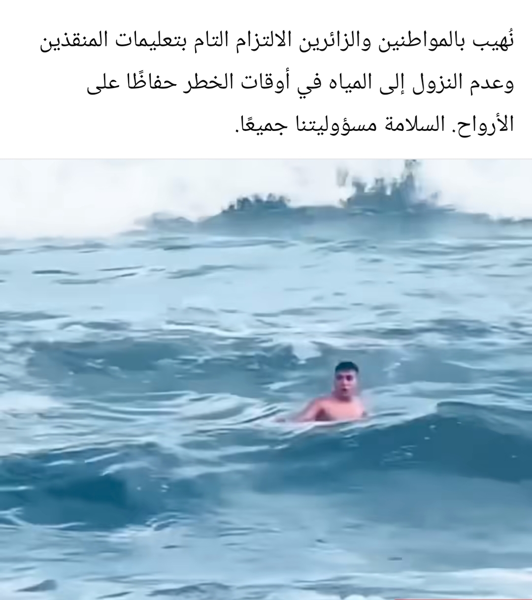 وأساد المستخدمون بشهامة المنقذ الذي تحرك بسرعة لسحب الشاب من بين الأمواج، رغم وجود لافتات تحذيرات على الشاطئ برفع الشارة الحمراء للتحذير من النزول، إلا أن الشاب خالف التعليمات وعرض حياته للخطر، ولولا تدخل المنقذ كانت الأمواج ستجرفه بعمق البحر.