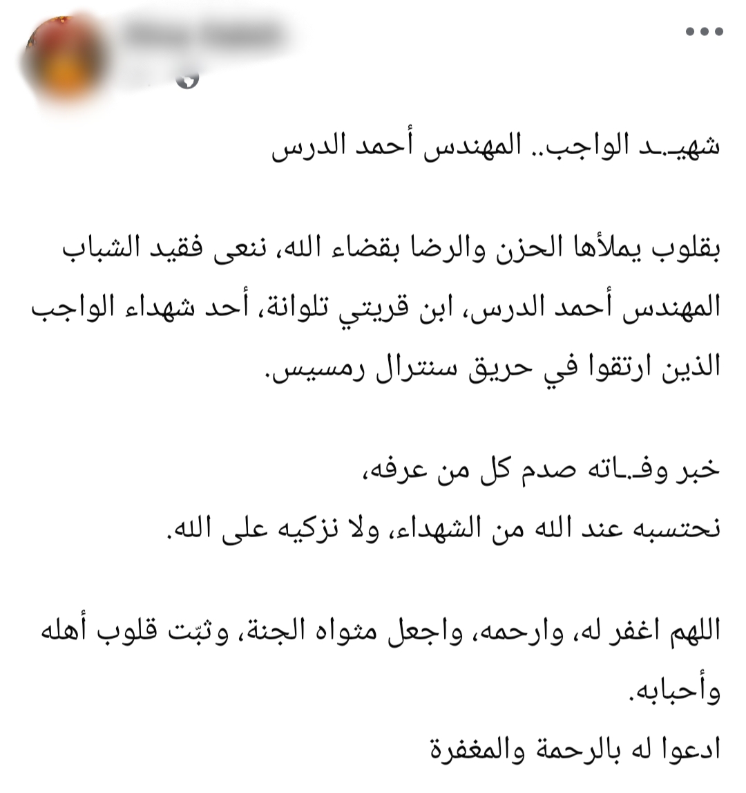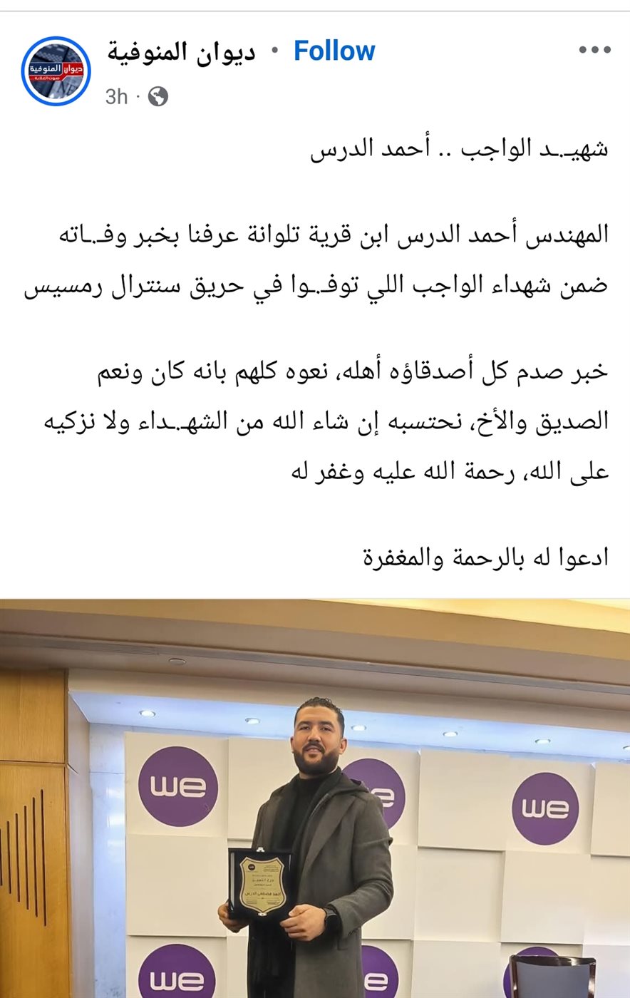 حزن في المنوفية بعد وفاة المهندس أحمد الدرس أحد ضحايا حريق سنترال رمسيس