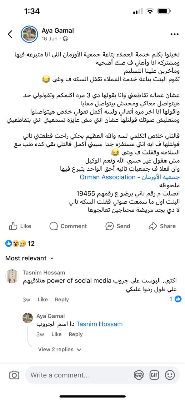 وكتبت: تخيّلوا بتكلم خدمة العملاء، تقول لي 3 مرات هيتواصلوا معايا ومفيش حد بيكلمني، وكل مرة أقول لهم أكمل، تقول لي: خلصتي؟ وتقطع عليا.