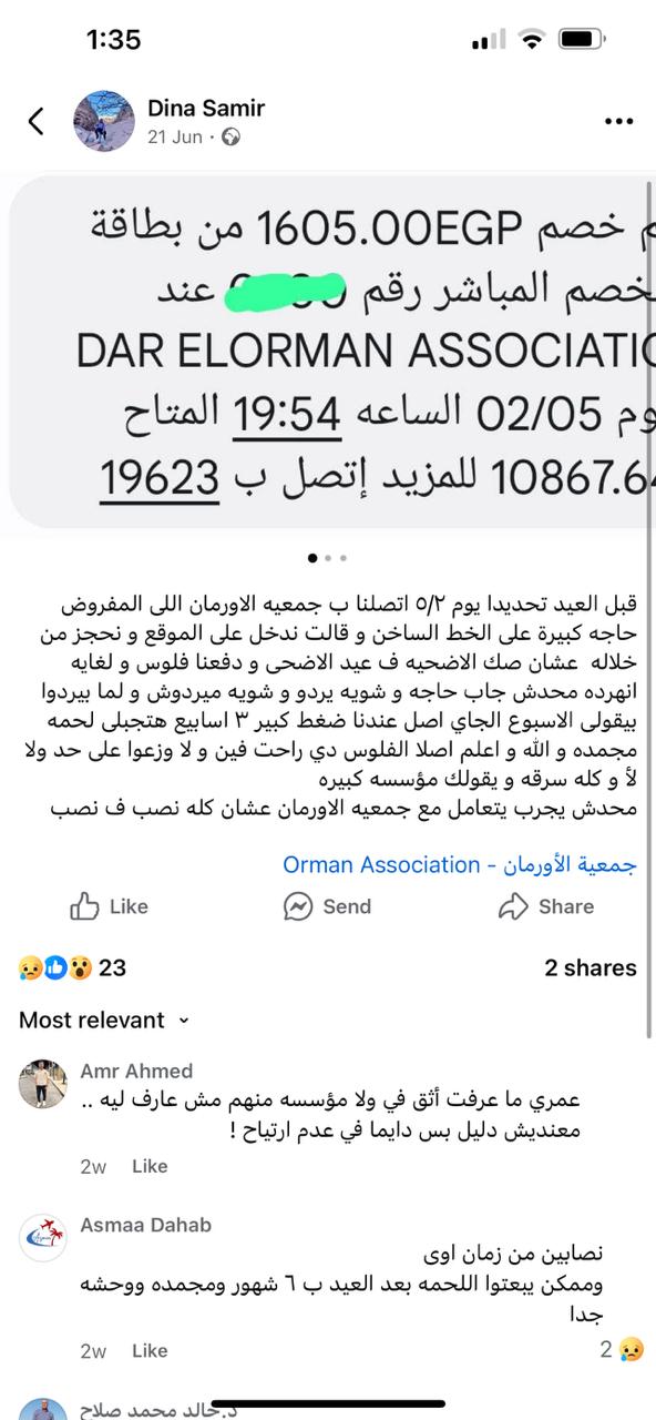 وتفاعل عدد من المستخدمين مع منشورها، مؤكدين تعرضهم لمواقف مشابهة، وعلّق أحدهم قائلًا: جمعية مشكوك في ذمتها، اتأخرت في تسليم نصيب الأضحية، ولو ما عملوش ده يوم الوقفة، يبقى ما عملوش أضحية أصلًا.
