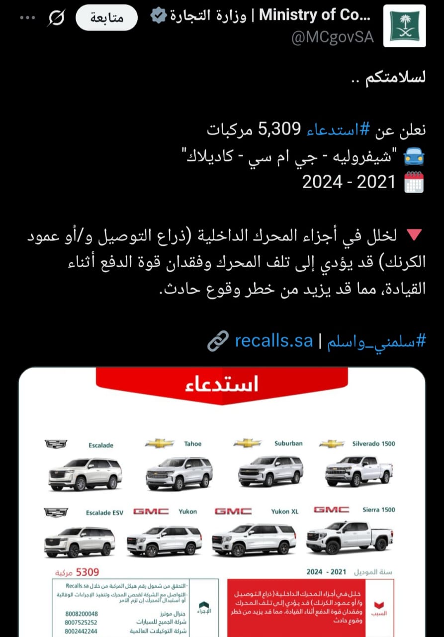 أعلنت وزارة التجارة السعودية عبر حسابها الموثق على منصة إكس، استدعاء 5309 سيارات، بسبب وجود خلل في المحرك.