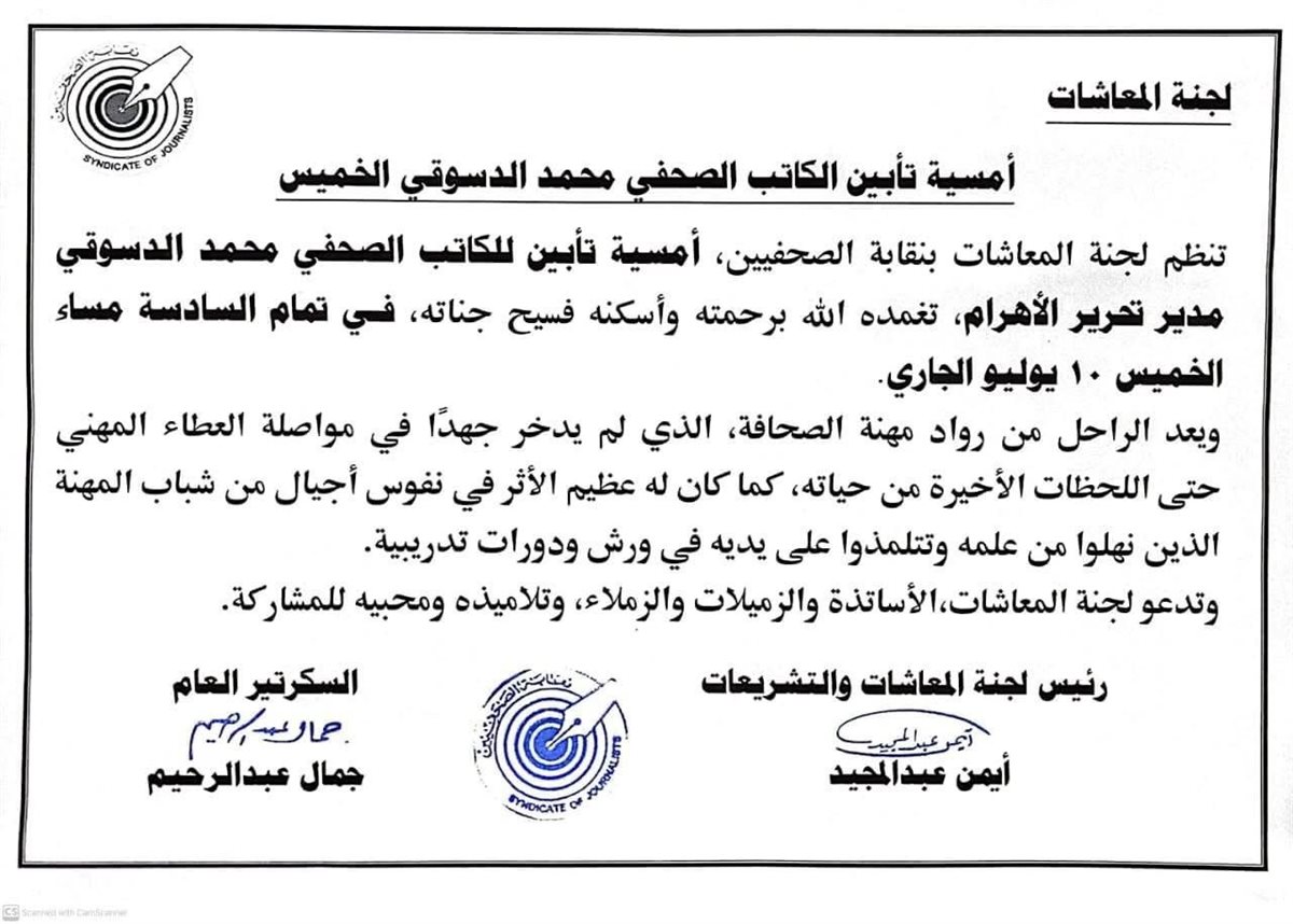 تنظم لجنة المعاشات بنقابة الصحفيين، أمسية تأبين للكاتب الصحفي محمد الدسوقي مدير تحرير الأهرام، في تمام السادسة مساء غد الخميس 10 يوليو الجاري.