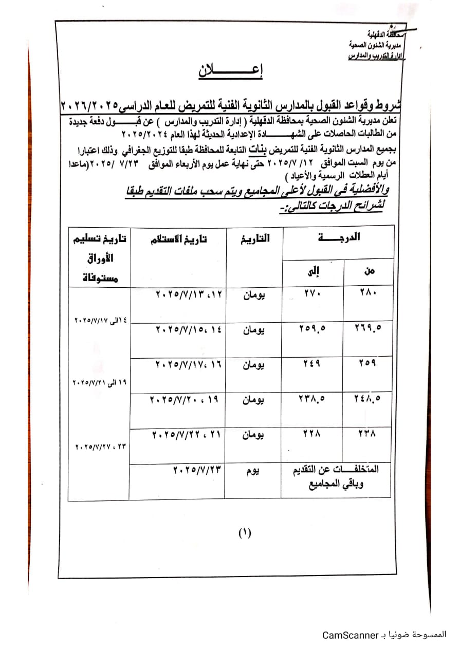 ويأتي فتح باب القبول للمدارس الفنية للتمريض ضمن جهود المديرية لتوفير فرص تعليم فني متخصص، وإعداد جيل جديد من الممرضات المؤهلات لخدمة القطاع الصحي في المستشفيات والوحدات التابعة لصحة الدقهلية.