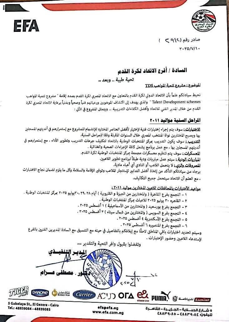 وأصدر الاتحاد المصري لكرة القدم خطابا عن تفاصيل مشروع تنمية المواهب والتي تتمثل في التالي:
