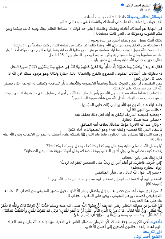 وقال في منشور له على صفحته الشخصية بموقع فيسبوك: الموت نهاية للخصومة وليس بدايتها، ومن شمات في ميت فقد وقع في ظلم أعظم من أي ظلم تعرض له، لأن الميت بين يدي ربه، والواجب الدعاء له بالرحمة والمغفرة، لا النيل منه أو التشفي في موته.