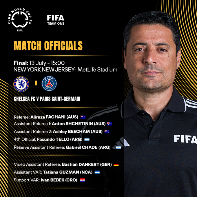 أعلن الاتحاد الدولي لكرة القدم فيفا، طاقم التحكيم الذي سيدير نهائي كأس العالم للأندية 2025، والذي يجمع بين باريس سان جيرمان الفرنسي وتشيلسي الإنجليزي.