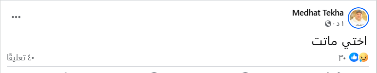 وكتب تيخا عبر حسابه الشخصي على فيس بوك: أختي ماتت، قبل أن يسارع أصدقاؤه ومتابعوه بكتابة كلمات العزاء له، والدعاء لشقيقته بالرحمة والمغفرة.
