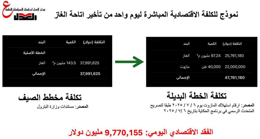 وقال حزب العدل في بيان له، اليوم، إيمانا بالحق في المعرفة، واستخدامًا لذات أرقام الاستهلاكات اليومية التي ساقها متحدث الوزارة في معرض نفيه، وباستخدام مخطط الذروة طبقا للوزارة ذاتها والتي وضعتها في مارس من هذا العام، يؤكد الحزب أن الخسارة اليومية نظرا لعدم الالتزام بخطط الإنتاج وتأخير إدخال مخططات إمداد الغاز تكلف الدولة قرابة الـ 10 ملايين دولار يوميًا فوق المخطط له بلا داعي.