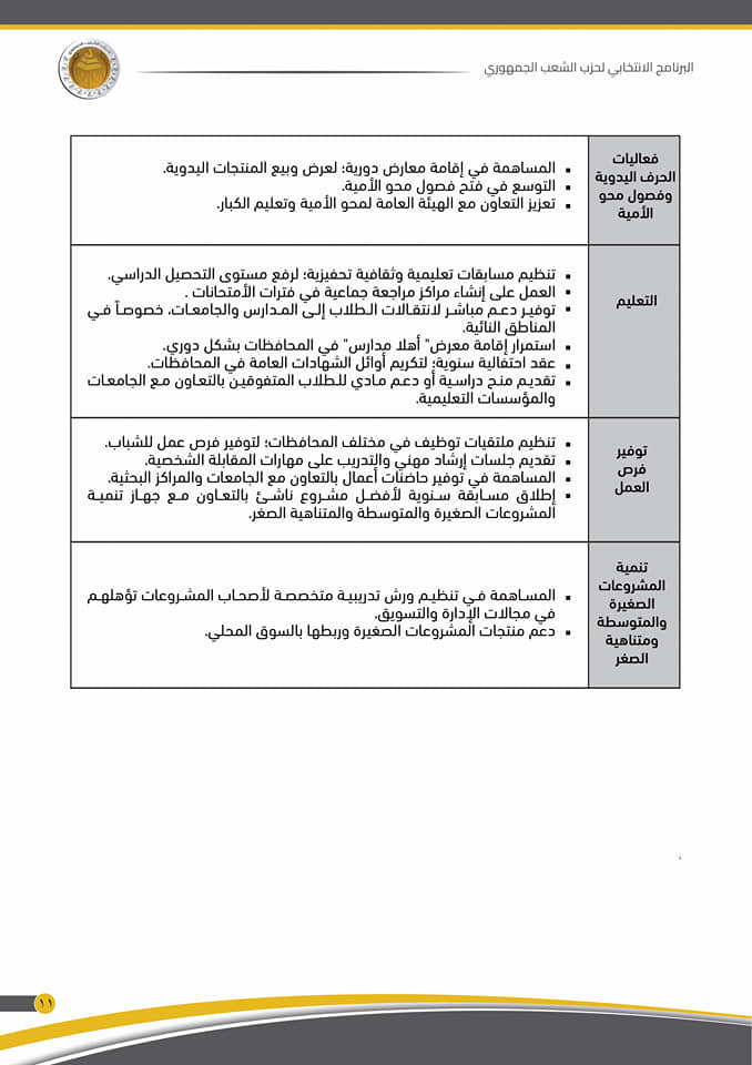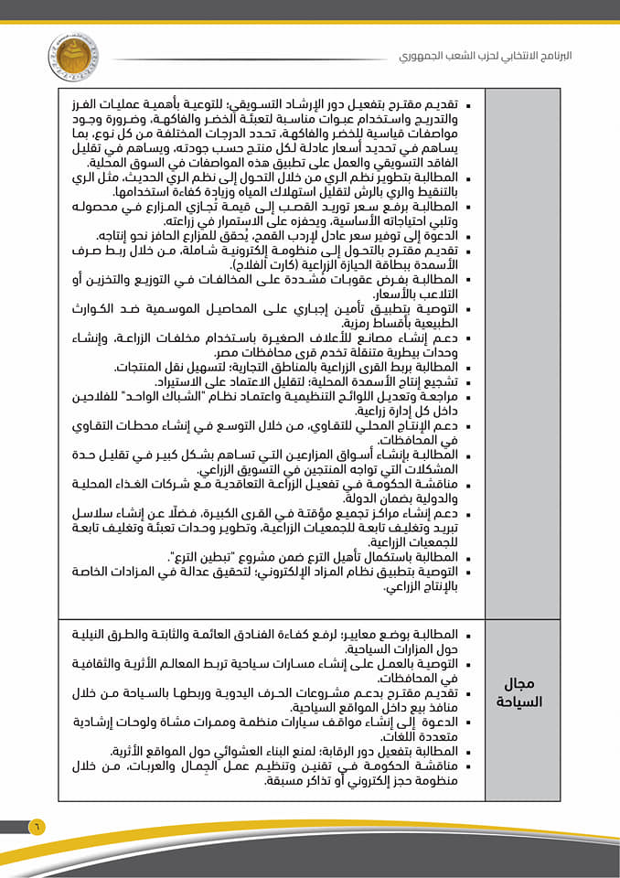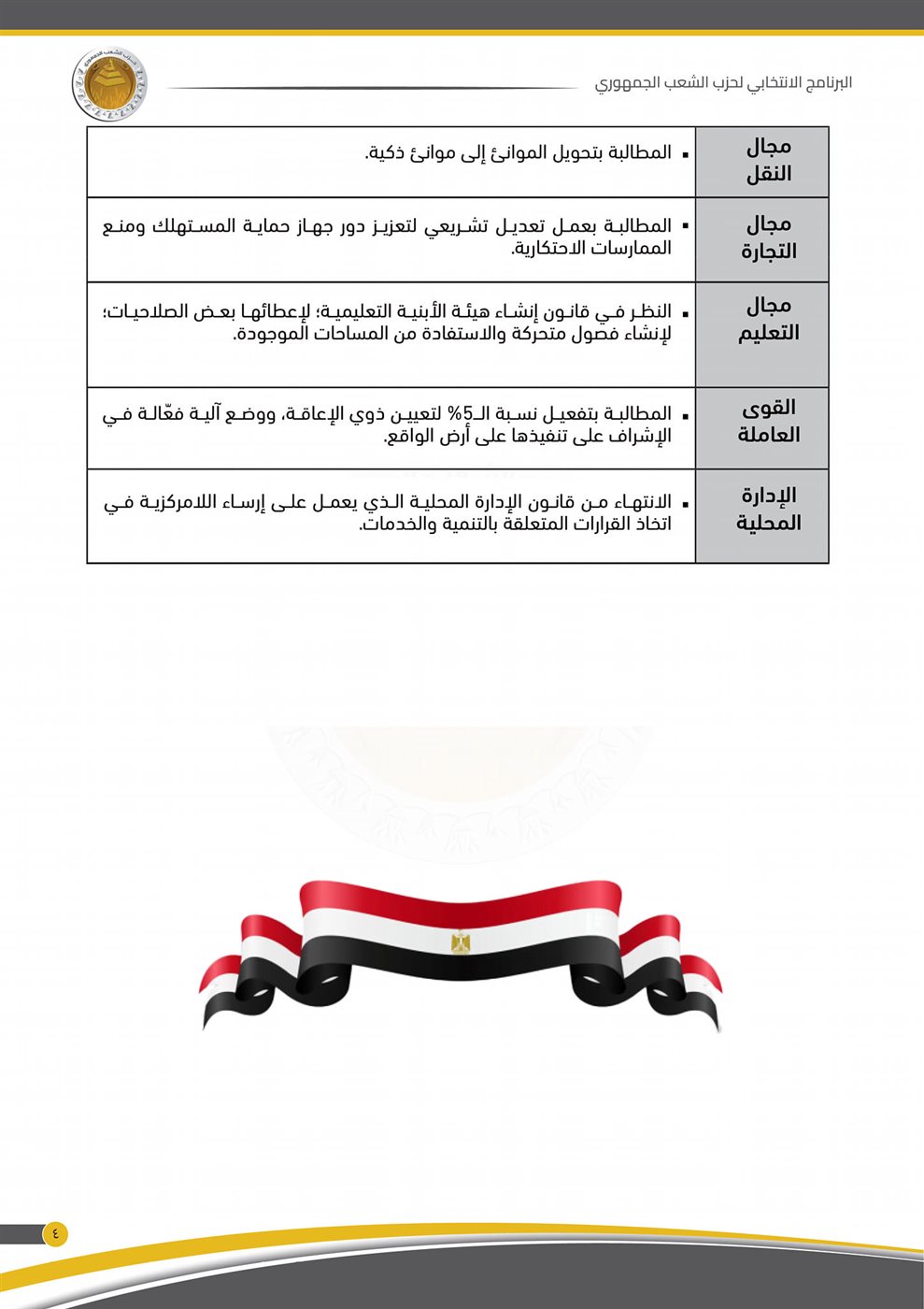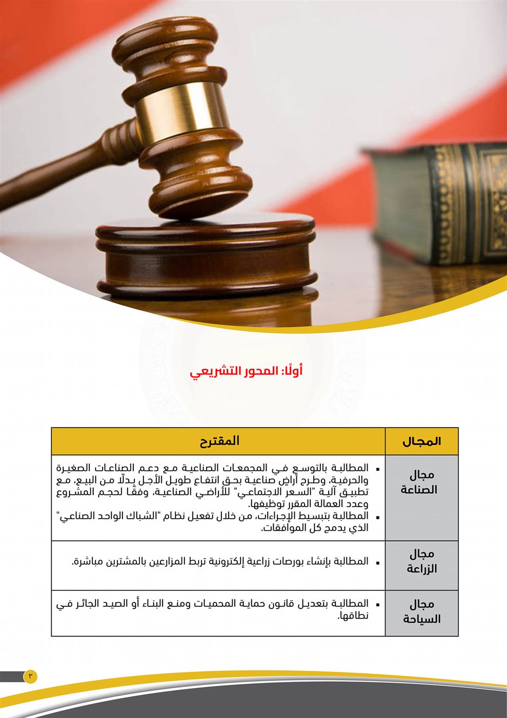 في المحور التشريعي، تعهد الحزب بأن يكون نوابه شركاء حقيقيين في صياغة السياسات العامة، وأدوات فعالة في التشريع والمساءلة، مع العمل على تفعيل كافة الأدوار التي كفلها الدستور للمؤسسة البرلمانية، سواء في الرقابة أو التشريع بما يضمن التوازن بين الحقوق والواجبات ويترجم أولويات المواطن إلى مشروعات قوانين واقعية تخدم التنمية، وتعزز مناخ الاستثمار وتدفع قطاعات الصناعة والزراعة والتجارة، بما يحقق نموا مستداما ينعكس مباشرة على حياة المواطنين.