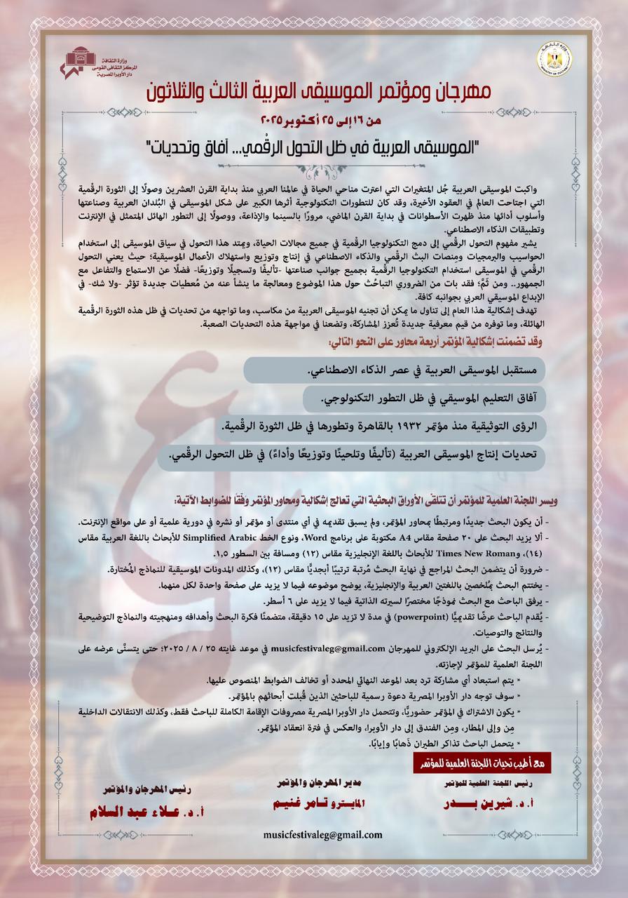 أعلنت وزارة الثقافة ممثلة في دار الأوبرا المصرية برئاسة الدكتور علاء عبد السلام المحاور البحثية للمؤتمر العلمي المصاحب لمهرجان الموسيقى العربية في دورته الـ33، والمقام في الفترة من 16 إلى 25 أكتوبر المقبل، والذي يديره المايسترو تامر غنيم، حيث أعدت اللجنة العلمية للمؤتمر برئاسة الدكتورة شيرين بدر 4 محاور رئيسية تأتي تحت عنوان الموسيقى العربية في ظل التحول الرقمي آفاق وتحديات.