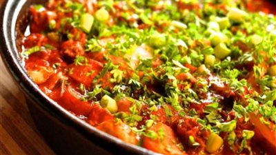 - يقدم طبق البيض بالطماطم وبألف هنا وشفا.