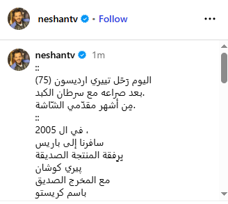نعى الإعلامي نيشان صديقه تييري أرديسون، الذي رحل عن عالمنا في الساعات الأولى من اليوم،بعد صراع مع المرض، حيث عانى الراحل في أيامه الأخيرة من سرطان الكبد، وهو الأمر الذي أدى إلى وفاته بعد رحلة من المرض.
