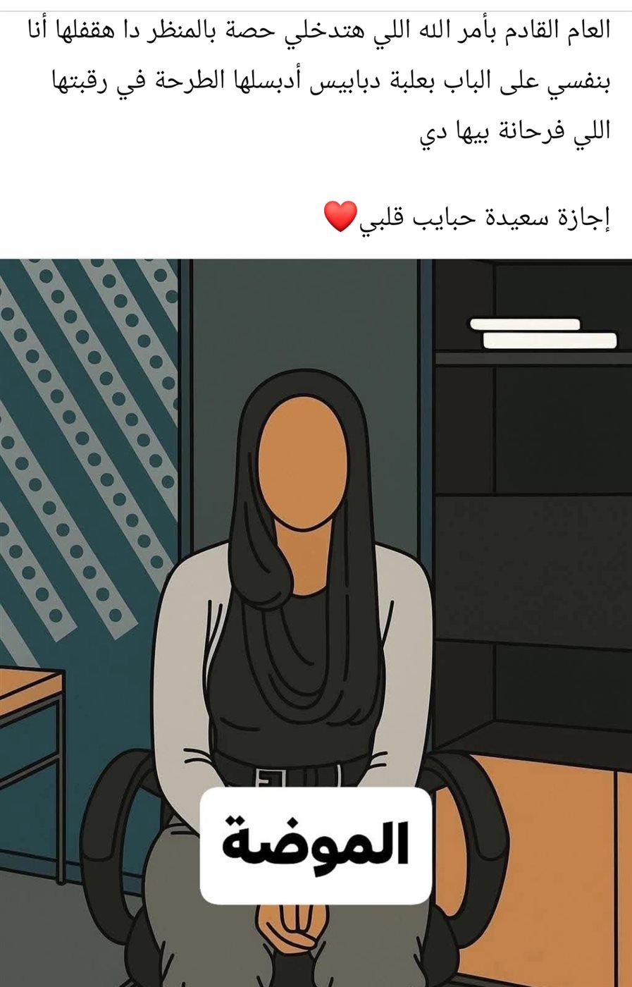 وقالت المعلمة في منشورها: طالباتي الأعزاء.. العام المقبل بأمر الله اللي هتدخلي حصة بالمنظر دا هقفلها أنا بنفسي على الباب بعلبة دبابيس أدبسلها الطرحة في رقبتها اللي فرحانة بيها دي، إجازة سعيدة حبايب قلبي.