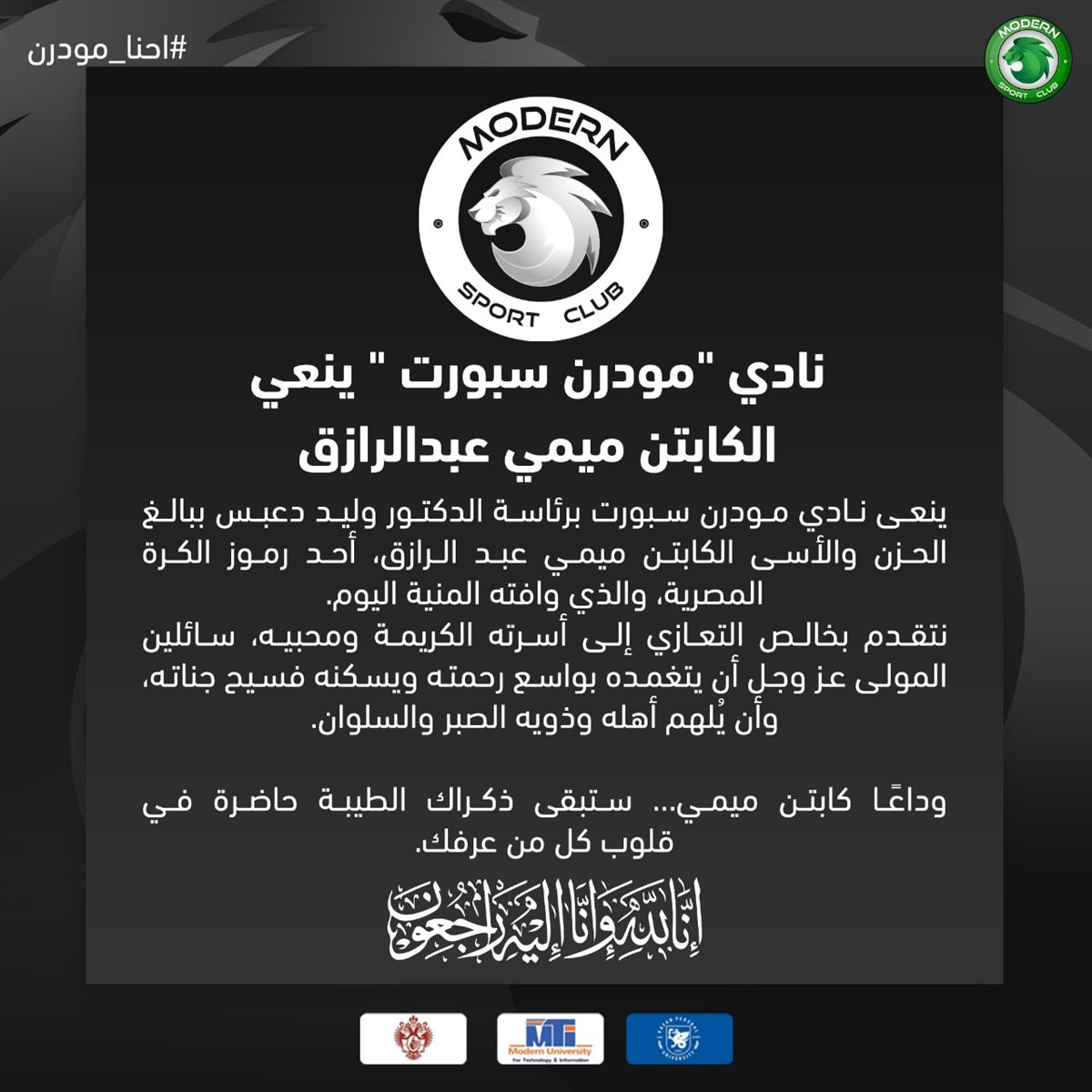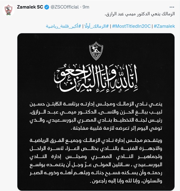 كما نعاه اللاعب شيكابالا، قائد نادي الزمالك المعتزل، وعدد كبير من نجوم ورموز كرة القدم في مصر، في مشهد يعكس حجم المحبة والتقدير الذي ناله الدكتور ميمي عبد الرازق خلال مسيرته الحافلة.