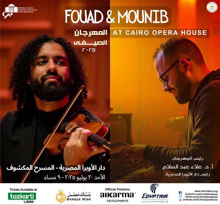 تتواصل فعاليات المهرجان الصيفي الذى تنظمه وزارة الثقافة ممثلة فى دار الأوبرا المصرية برئاسة الدكتور علاء عبد السلام يقدم الثنائى الموسيقى محمد فؤاد (بيانو) وأحمد منيب (كمان) حفلًا مميزًا يجمع بين الكلاسيكية والمعاصرة ويستضيف المنشد مصطفى مهلل والمؤلف الموسيقى خالد الكمار بمصاحبة أوركسترا تضم 20 عازفًا وذلك في التاسعة مساء الأحد 20 يوليو على المسرح المكشوف.