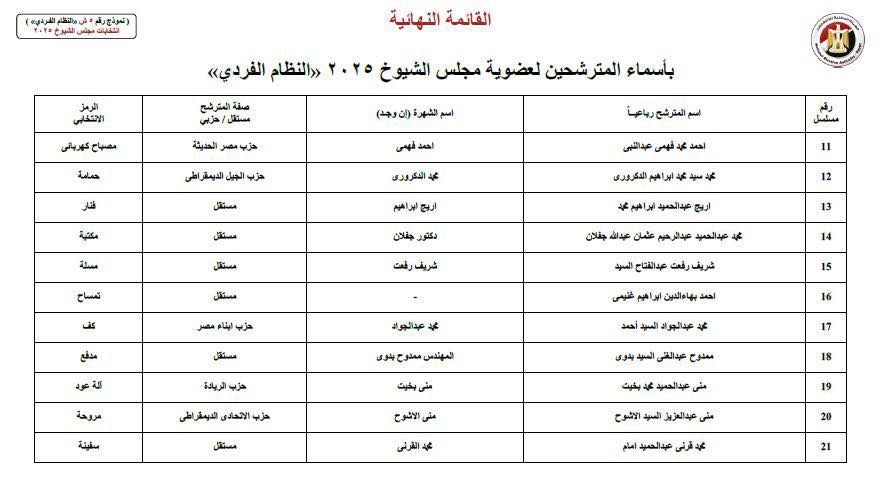 القائمة النهائية للمترشحين على النظام الفردي لمجلس الشيوخ