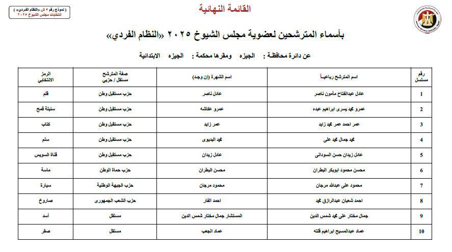 القائمة النهائية للمرشحين على النظام الفردي لمجلس الشيوخ عن دائرة محافظة الجيزة