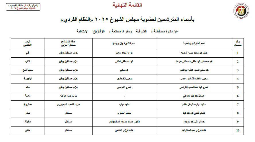 القائمة النهائية لمرشحي النظام الفردي لمجلس الشيوخ عن دائرة محافظة الشرقية