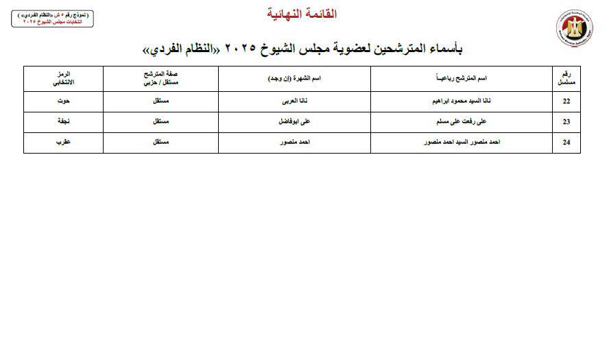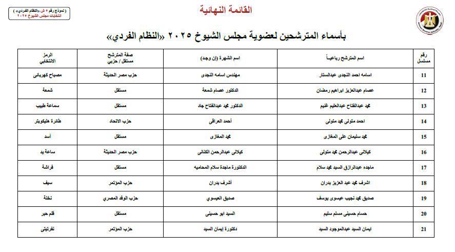 القائمة النهائية للمترشحين على النظام الفردي لمجلس الشيوخ
