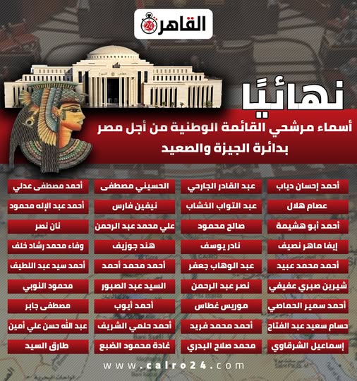 أعلنت الهيئة الوطنية للانتخابات أسماء المرشحين ضمن القائمة الوطنية من أجل مصر لخوض انتخابات الشيوخ بدائرة الجيزة والصعيد.