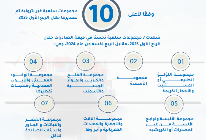 استعرض مركز المعلومات ودعم اتخاذ القرار بمجلس الوزراء، تطور قيمة الصادرات المصرية من السلع غير البترولية وفقا لأعلى مجموعات السلع تصديرا خلال الربع الأول 2025.