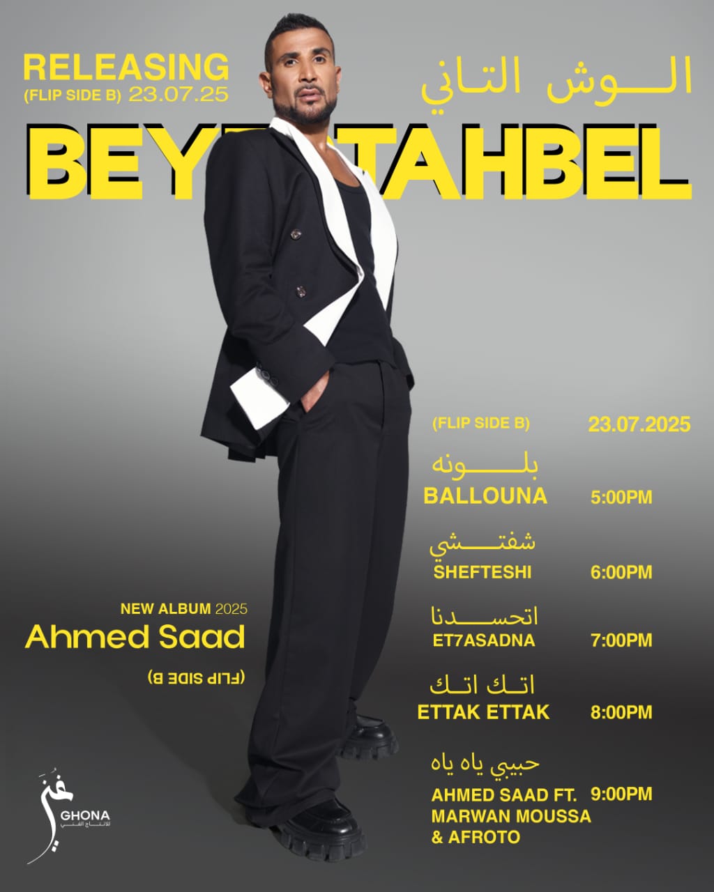 أعلن الفنان أحمد سعد تفاصيل ومواعيد إطلاق "الوش التاني" من ألبوم "بيستهبل" والذي يضم 5 أغنيات، وذلك بعد النجاح الكبير لأغنيات الوش الأول من الألبوم الذي أطلقه الأسبوع الماضي، من 5 أغنيات وتصدرت التريند عبر عدد كبير من منصات التواصل الاجتماعي لستة أيام متتالية.