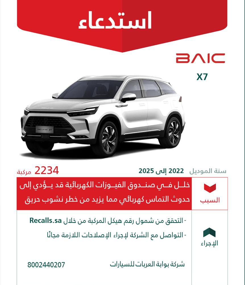 أعلنت وزارة التجارة السعودية عبر حسابها الموثق على منصة إكس، استدعاء استدعاء 2234 سيارة بايك.
